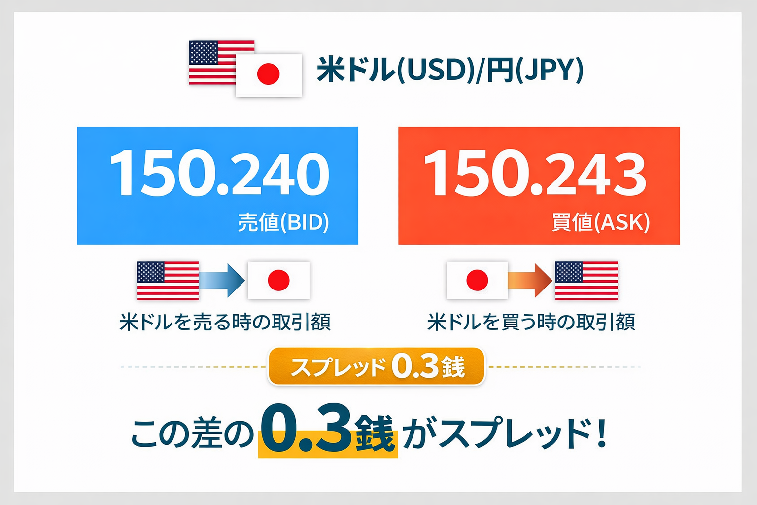 スプレッドとは、同じ通貨ペアに表示されている買値(Ask)売値(Bid)の差のことです。たとえば、米ドル/円で「売値 150.240」「買値 150.243」と表示されていれば、その差である0.003円、つまり0.3銭がスプレッドです。